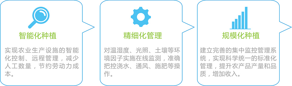 溫室生產(chǎn)管控解決方案通過對(duì)溫室內(nèi)溫濕度、土壤水分、光照度、光合效率、二氧化碳、光照度等進(jìn)行數(shù)據(jù)監(jiān)測(cè),通過無線技術(shù)傳輸至云平臺(tái)加工處理,并在手機(jī)、電腦、平板上實(shí)時(shí)顯示。用戶還可通過軟件平臺(tái)對(duì)溫室濕簾風(fēng)機(jī)、噴淋滴灌、內(nèi)外遮陽、頂窗側(cè)窗、加溫補(bǔ)光等設(shè)備進(jìn)行控制。從而達(dá)到溫室種植的智能化管理,減輕用戶的工作量,節(jié)省用戶用工成本和管理成本。